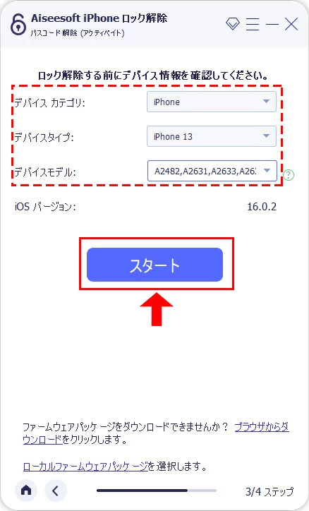 さらに、デバイスのカテゴリとタイプを選択してください。デバイスの情報を確認できたら、「スタート」をクリックして次のステップに進みます。