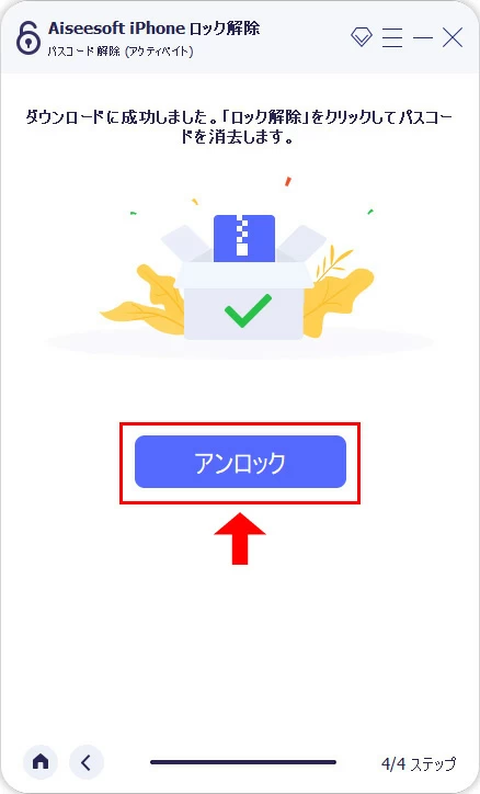 ファームウェアパッケージのダウンロードが完了したあとロック解除を確認の画面が表示されます、「アンロック」をクリックして続行します。