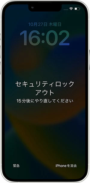 9 回目の推測を過ぎても正しいパスコードが入力されていない場合は、iPhone の画面に「セキュリティロックアウト 15分後にやり直してください」というメッセージが表示されます。